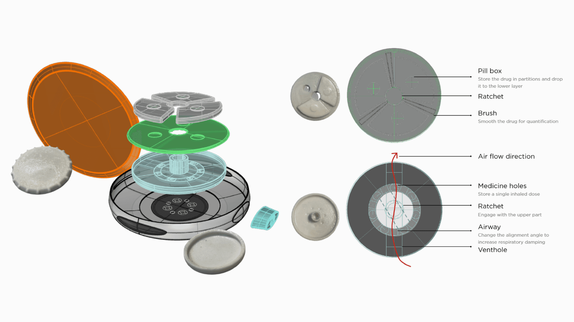 Through investigation of current inhalation device's structure, I decide to make an integration, the inhale part were fully mechanical, to make sure it functions perfectly under any circumstances. while the electronic part only monitor the dosage and leftover of the medicine.